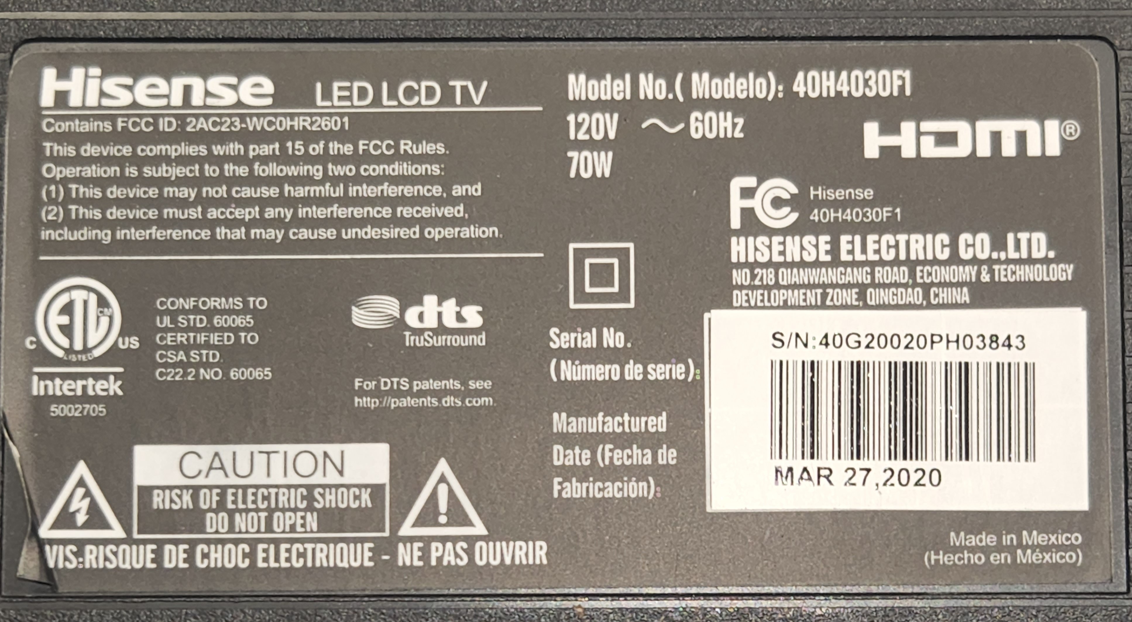 | 2 | Hisense | 40H4030F1 | ![]() | Cracked Screen | |||