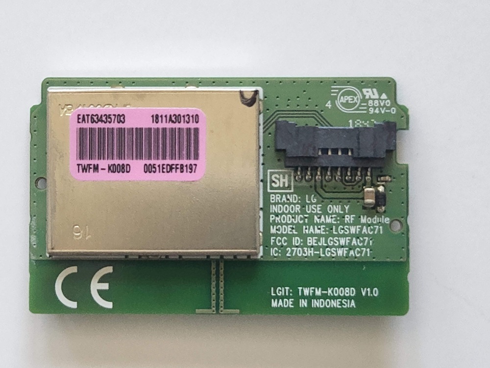 | 5 | Wireless/Wifi/Adapter Module | 1 | 1 | LG EAT63435703 | 5 | yes | Itm#: 5 FrmTV: 1 Qty: 1 Bin#: 5 Tstd: 1 ItmTyp: Wireless/Wifi/Adapter Module LG EAT63435703 | ||