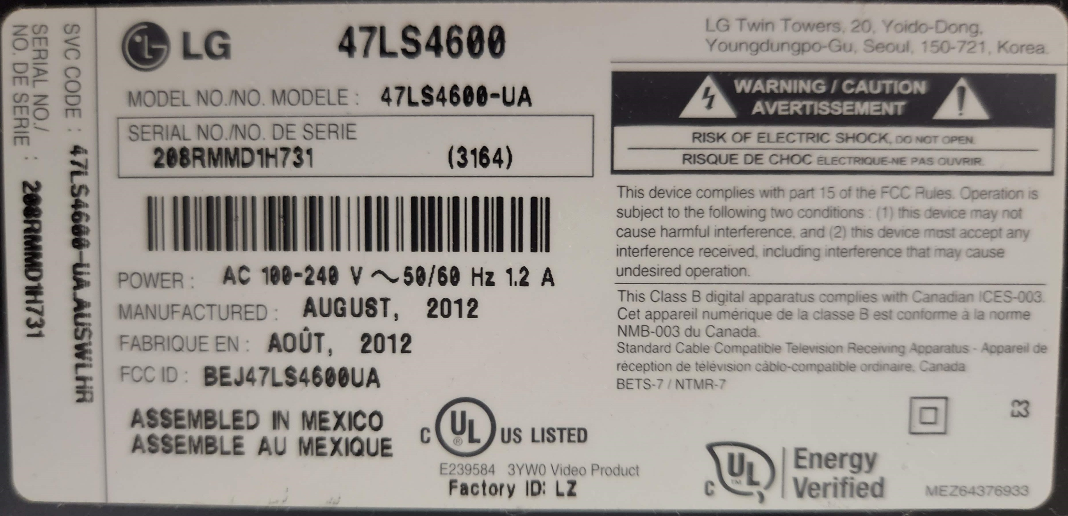 | 6 | LG | 47LS4600 | ![]() ![]() | Working / Horiz. Lines | |||