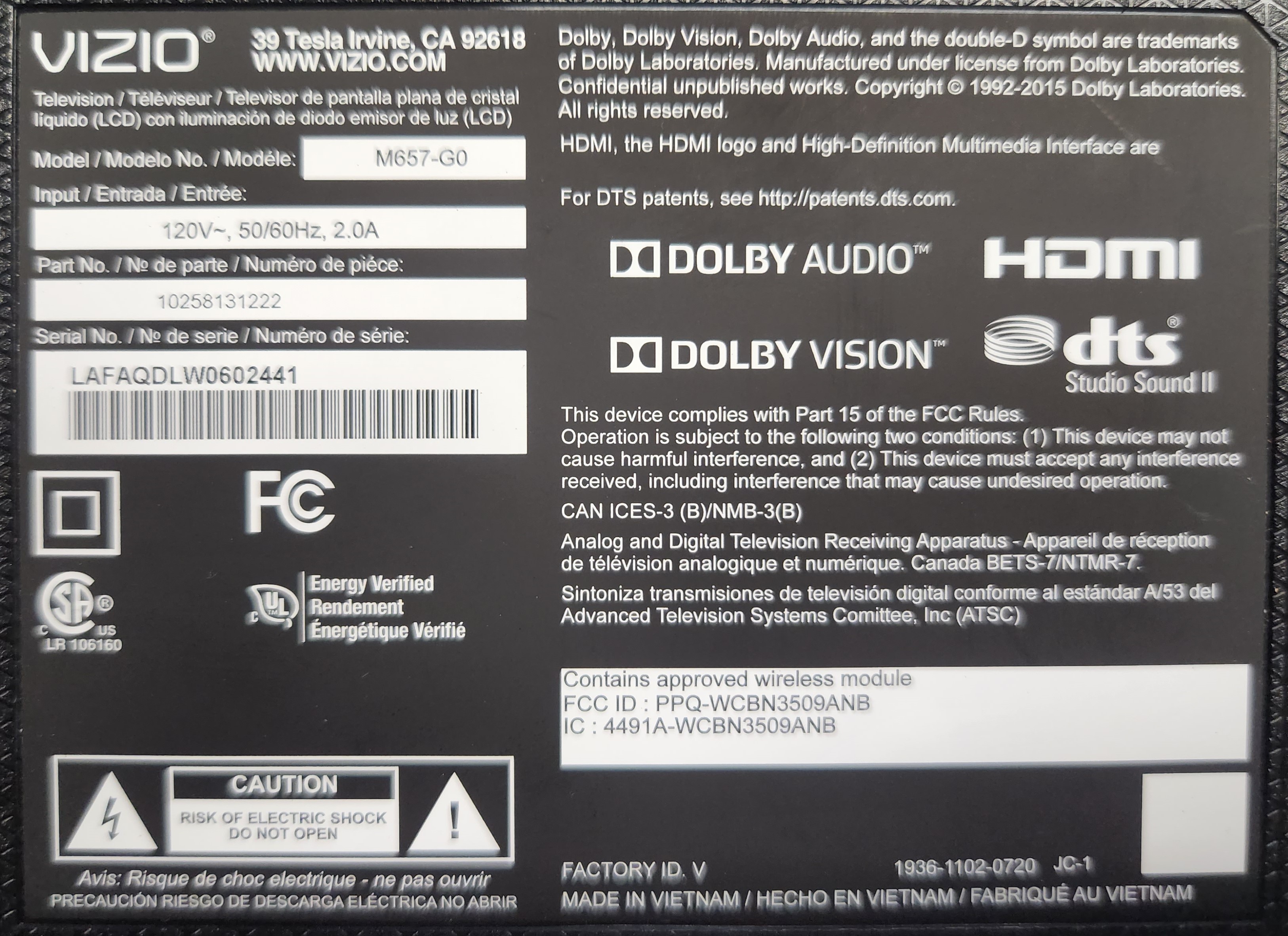 | 3 | Vizio | M657-G0 | LAFAQDLW | ![]() | Cracked Screen | ||
